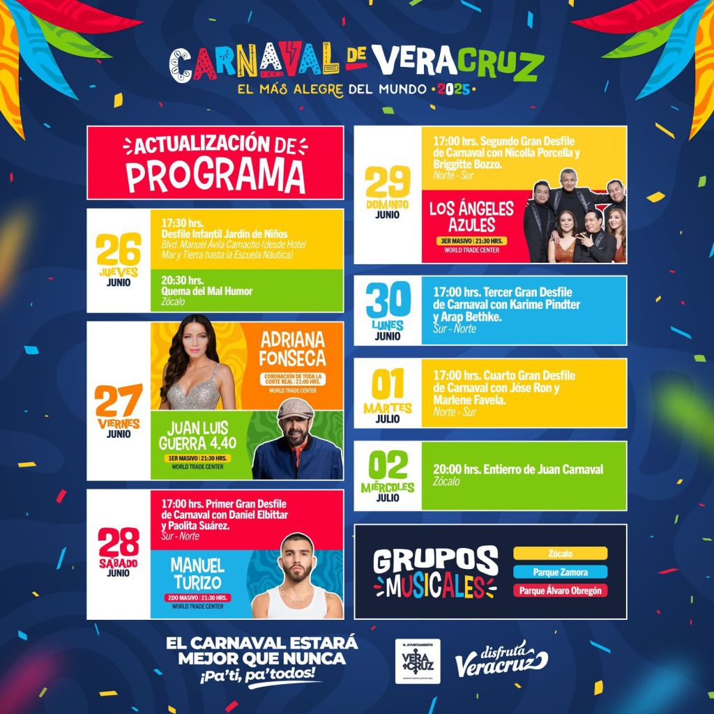 Veracruz, Ver., 24 de junio de 2025.- La alcaldesa Paty Lobeira informó que, debido a las condiciones meteorológicas que se han presentado en la región, y con el compromiso de garantizar la seguridad de todas y todos los asistentes, se han realizado ajustes en la programación del Carnaval de Veracruz 2025.