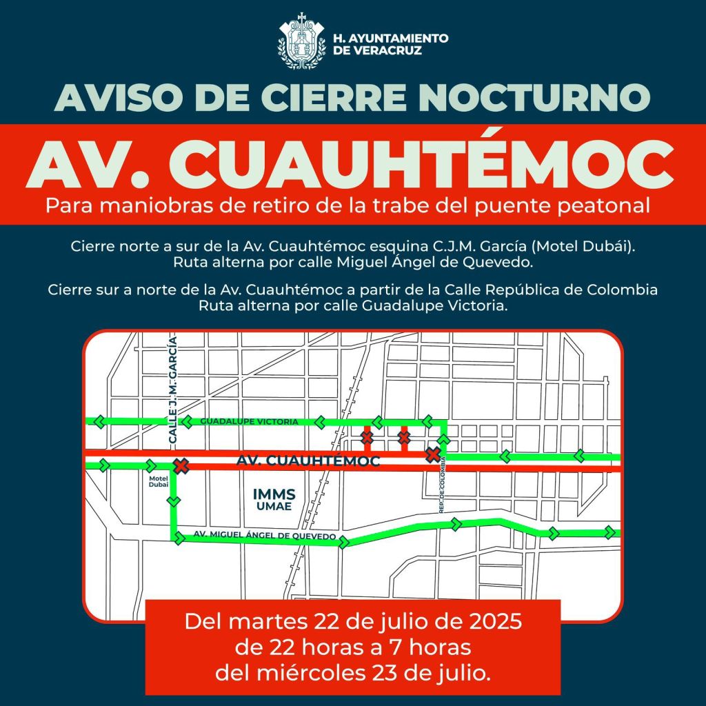 Veracruz, Ver., 21 de julio de 2025.- El H. Ayuntamiento de Veracruz informa a los automovilistas y ciudadanía que, con motivo de los trabajos de mantenimiento que se realizan en el puente peatonal de la avenida Cuauhtémoc, frente al IMAE-IMSS del Centro Médico Nacional “Adolfo Ruiz Cortines”, esta vialidad será cerrada a la circulación vehicular en ambos sentidos.