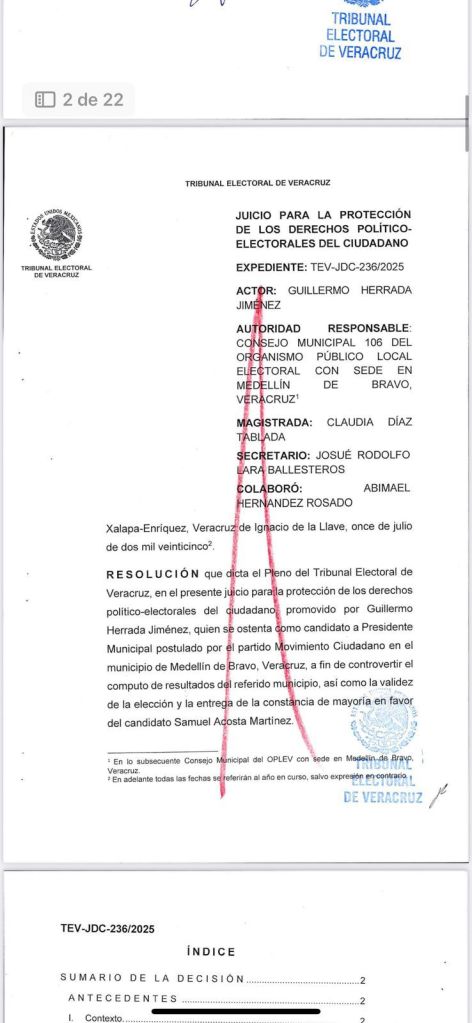 Medellín de Bravo, Ver., 24 de julio de 2025 — El Tribunal Electoral de Veracruz (TEV) resolvió este jueves validar la elección de Samuel Acosta como presidente municipal electo de Medellín de Bravo, desechando por unanimidad la impugnación presentada por el excandidato de Movimiento Ciudadano, Guillermo Herrada.