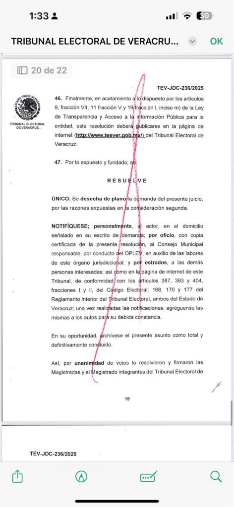 Con esta determinación, se ratifica la voluntad popular expresada en las urnas por la ciudadanía de Medellín de Bravo, que otorgó el respaldo mayoritario a Samuel Acosta como nuevo alcalde para el periodo 2026–2029.