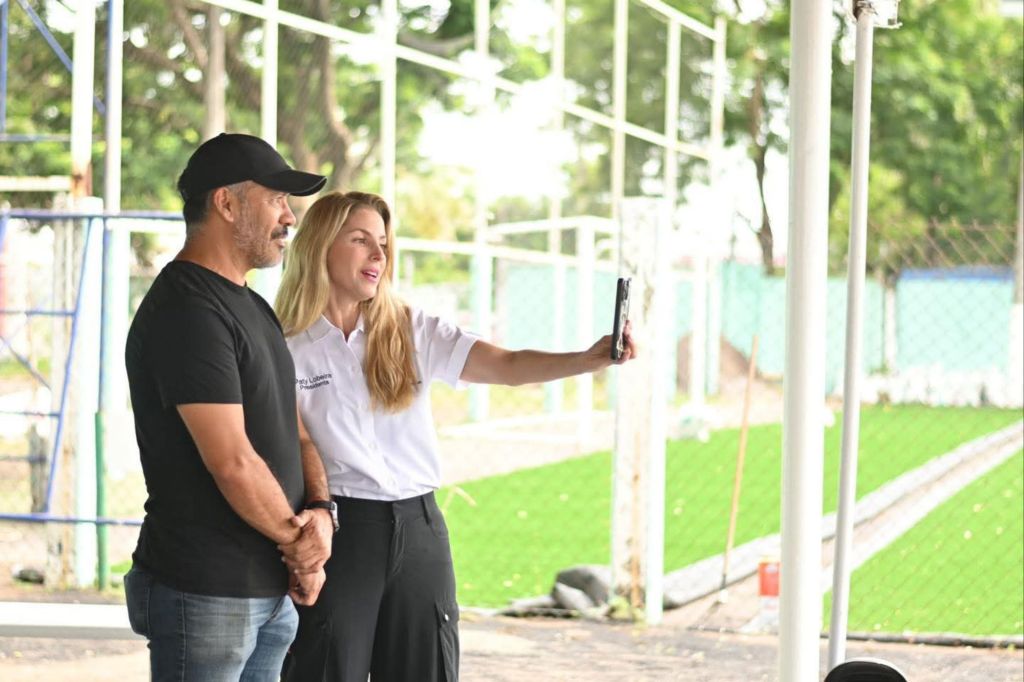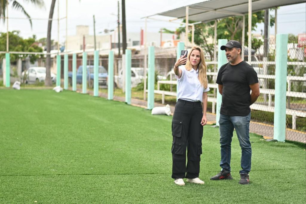 Acompañada por personal de Fomento Deportivo, la alcaldesa detalló que también se hará el cambio completo de la alfombra de la cancha, la instalación de arena sílica y caucho, además de la renovación de la malla que rodea el campo.