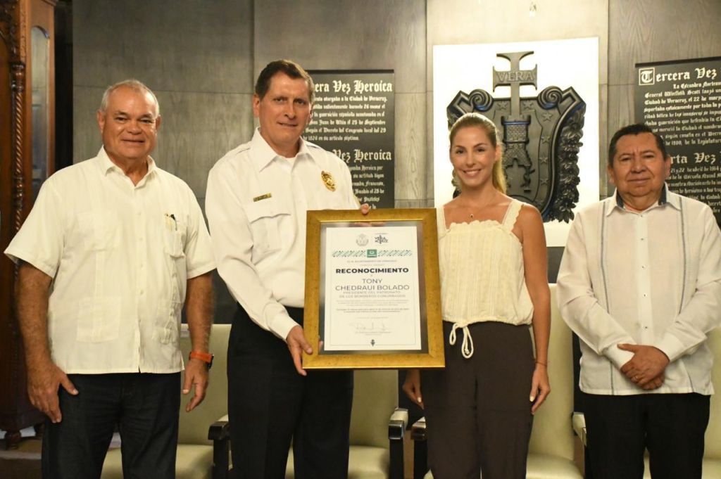 En la ceremonia realizada en la Sala de Cabildo del Palacio Municipal de Veracruz, hizo entrega de reconocimientos a Antonio Chedraui Bolado, presidente del Patronato de Bomberos Conurbados, por más de cuatro décadas de trabajo en el fortalecimiento de la institución.