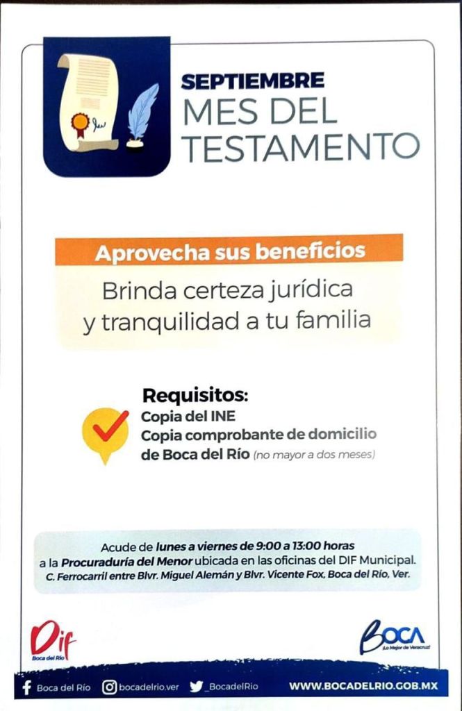Con el objetivo de fomentar la cultura de la previsión y garantizar certeza jurídica al patrimonio de las familias, el Ayuntamiento de Boca del Río se suma a la campaña “Septiembre, Mes del Testamento”, una iniciativa de gran importancia social que busca que más ciudadanos actúen responsablemente para no heredar problemas a sus seres queridos.
