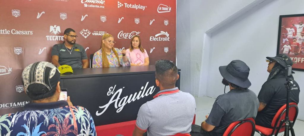 Presidieron la conferencia de prensa: Jhoanna Lizbeth Gómez, creadora de contenidos y coordinadora general de la Velada Jarocha; Gina Cano Ayuso, presidenta del Grupo Reto Veracruz y Adriel Triana, titular del Comité Municipal de Boxeo Veracruzano.