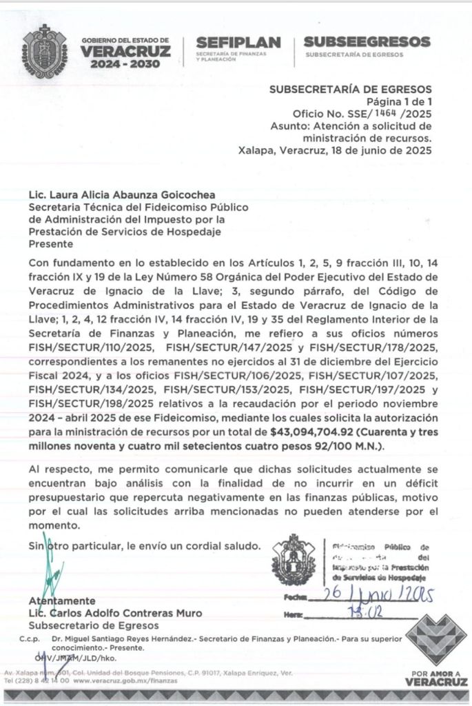 En oficio de respuesta emitido por el subsecretario de Egresos, Carlos Adolfo Contreras Muro, en respuesta a una solicitud de la secretaria técnica del Fideicomiso Público de Administración del Impuesto por la Prestación de Servicios de Hospedaje, Laura Alicia Abaunza Goicochea, confirmó que no se deposita el recurso de 43 millones 94 mil 704 pesos y 92 centavos, desde el mes de diciembre del 2024.