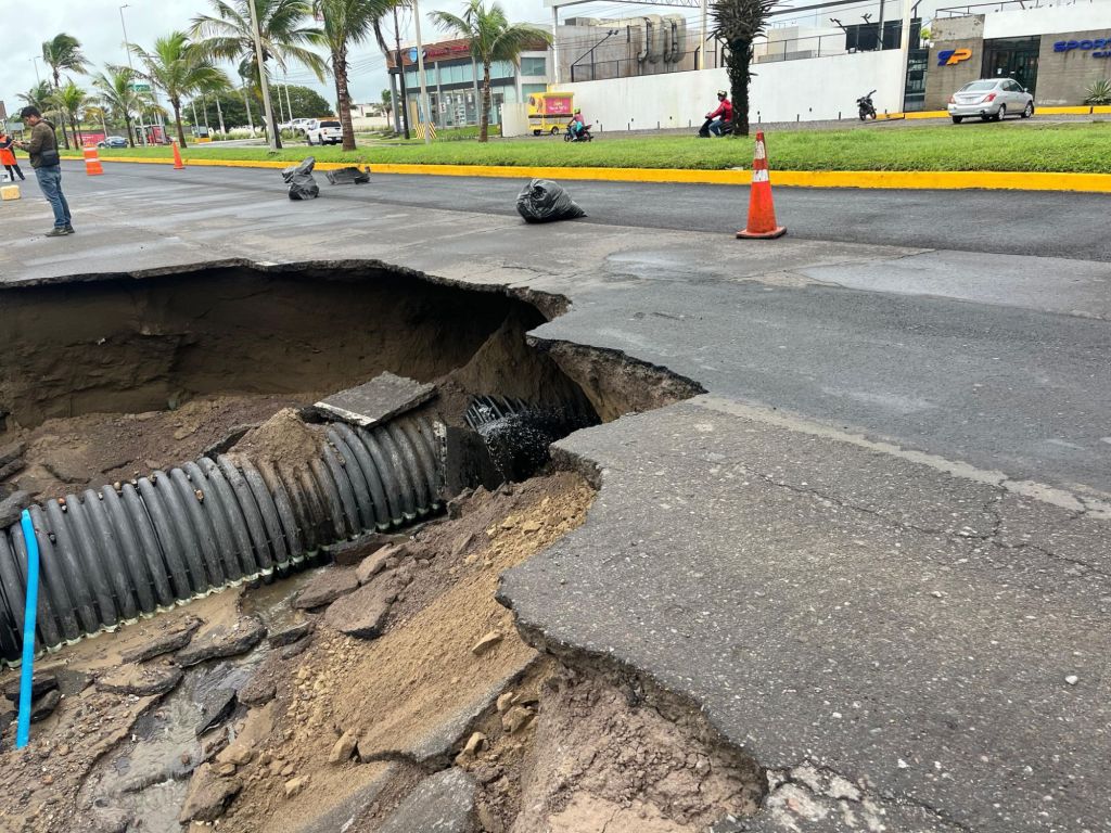 Alvarado, Ver.- Un tramo del boulevar Riviera Veracruzana que conduce del municipio de Boca del Río a la localidad de Antón Lizardo en Alvarado fue cerrado en su totalidad debido a un enorme socavón que se registró tras las intensas lluvias de este martes 7 de octubre.