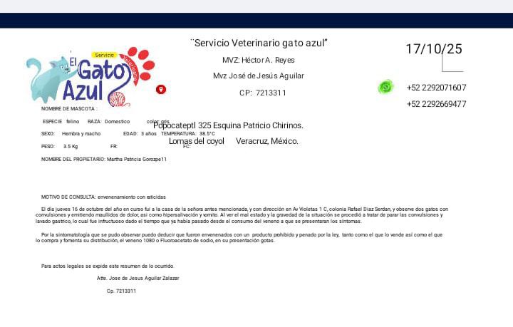 “Nosotros denunciamos, fuimos a la fiscalía que está acá por Las Bajadas, nos dijeron que no, que era para personas desaparecidas, nos mandaron a la veterinaria municipal que está enfrente del panteón municipal y nos pidieron mil papeles, nos pidieron la constancia médica, mandé fotos, les enseñamos las fotos, llevamos las muestras de donde ellos habían vomitado la comida con el veneno y literalmente nos dijeron que para que nos hagan caso tendríamos que tener grabado en tiempo y forma al señor cómo nos está dando el veneno a los gatos y ver cómo está sacando el veneno, o sea casi casi quiere que llevemos al señor de la mano con el veneno y el gato muerto para que uno le diga, miren, si aquí está, él lo está haciendo”.