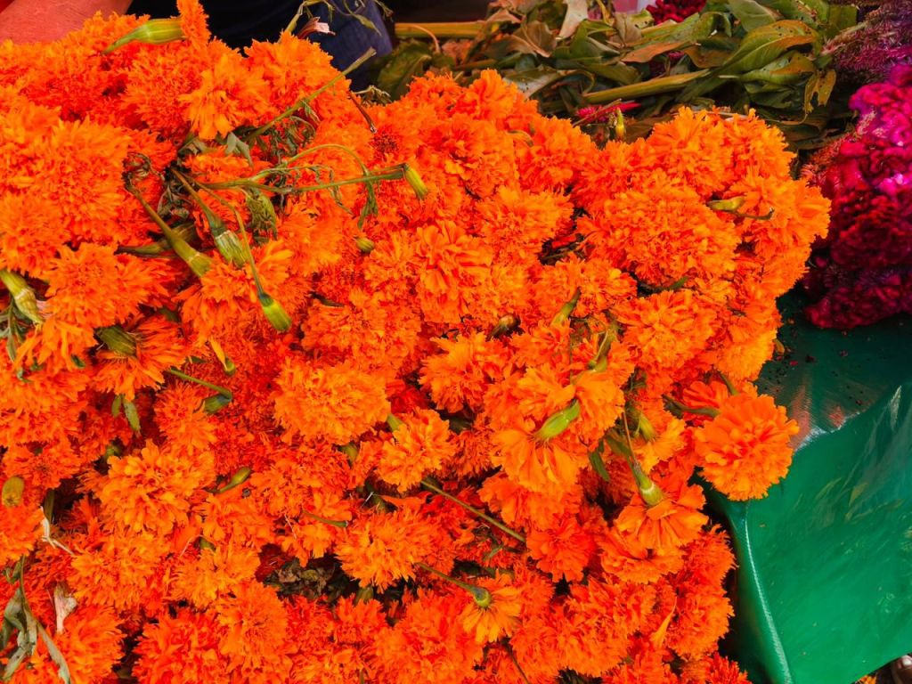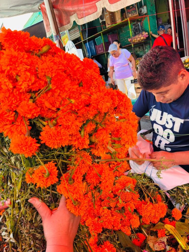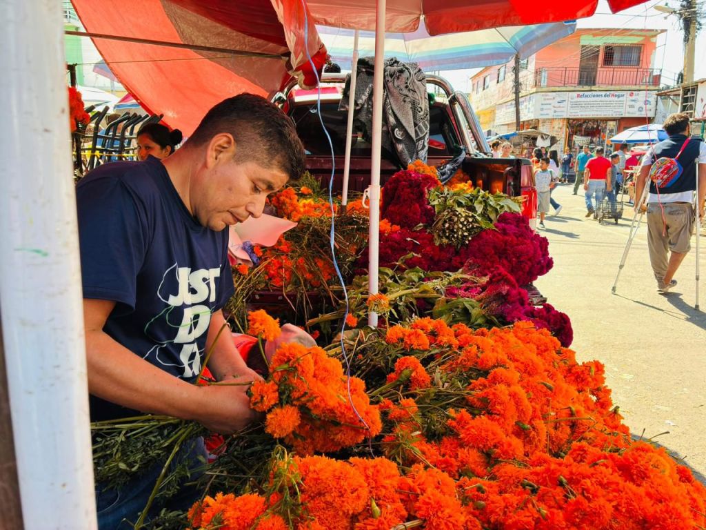 En la zona de mercados del Centro Histórico, los puestos lucen abarrotados de macetas y rollos de esta flor tradicional que adorna los altares de los difuntos.