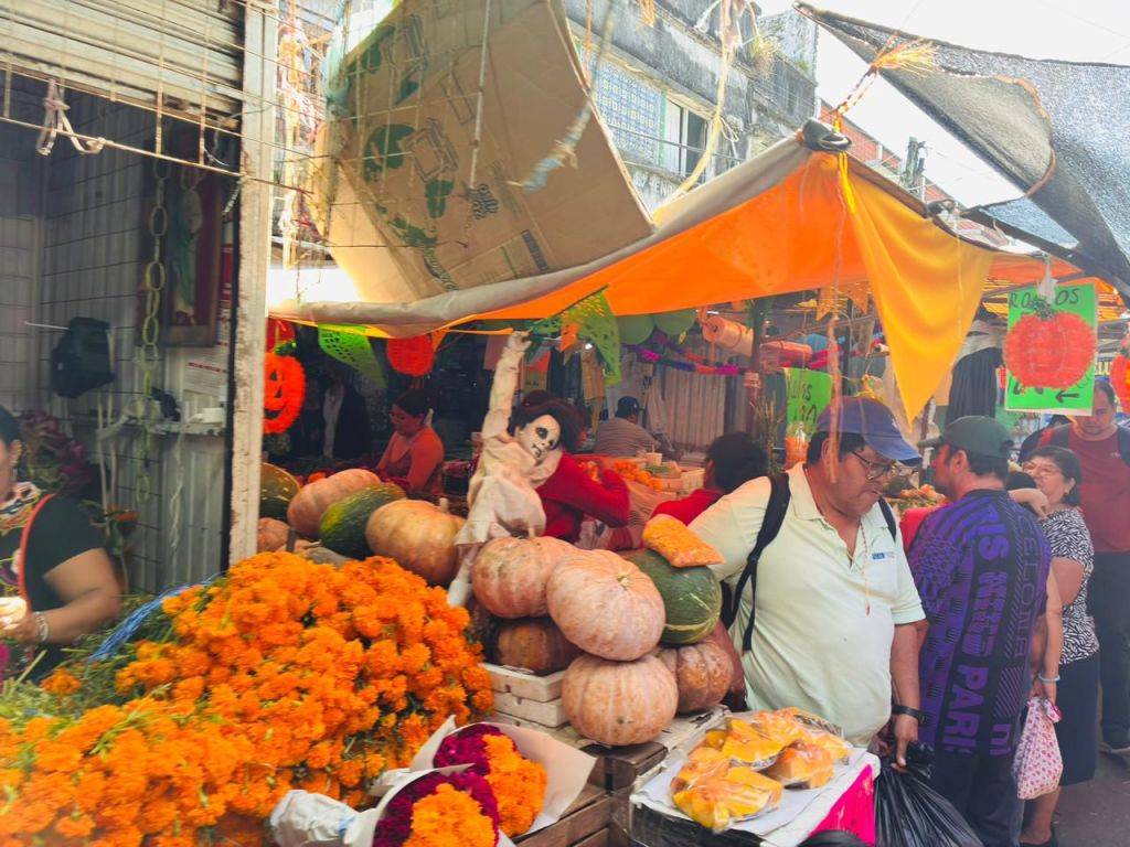 En la zona de mercados del puerto de Veracruz la ciudadanía no pospone sus tradiciones. Pese al bochorno, los pasillos se llenan de vida: los mercados del Centro están abarrotados de personas que acuden a comprar todo lo necesario para montar su altar de muertos.