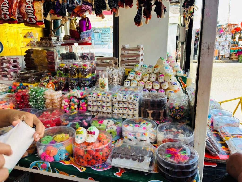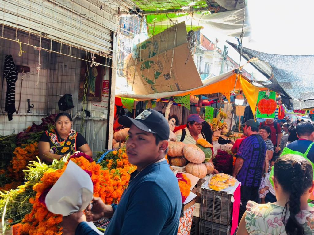 Desde temprano, los puestos despliegan flores, velas, veladoras, dulces típicos, tamales y papel picado. Los clientes buscan también frutas, comida tradicional y otros objetos imprescindibles para su ofrenda.