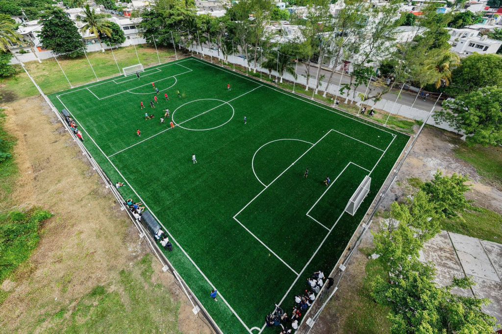 Entre otras acciones que se incluyeron fue la colocación de más de 3 mil metros cuadrados de pasto sintético, se instalaron porterías y bancas deportivas.