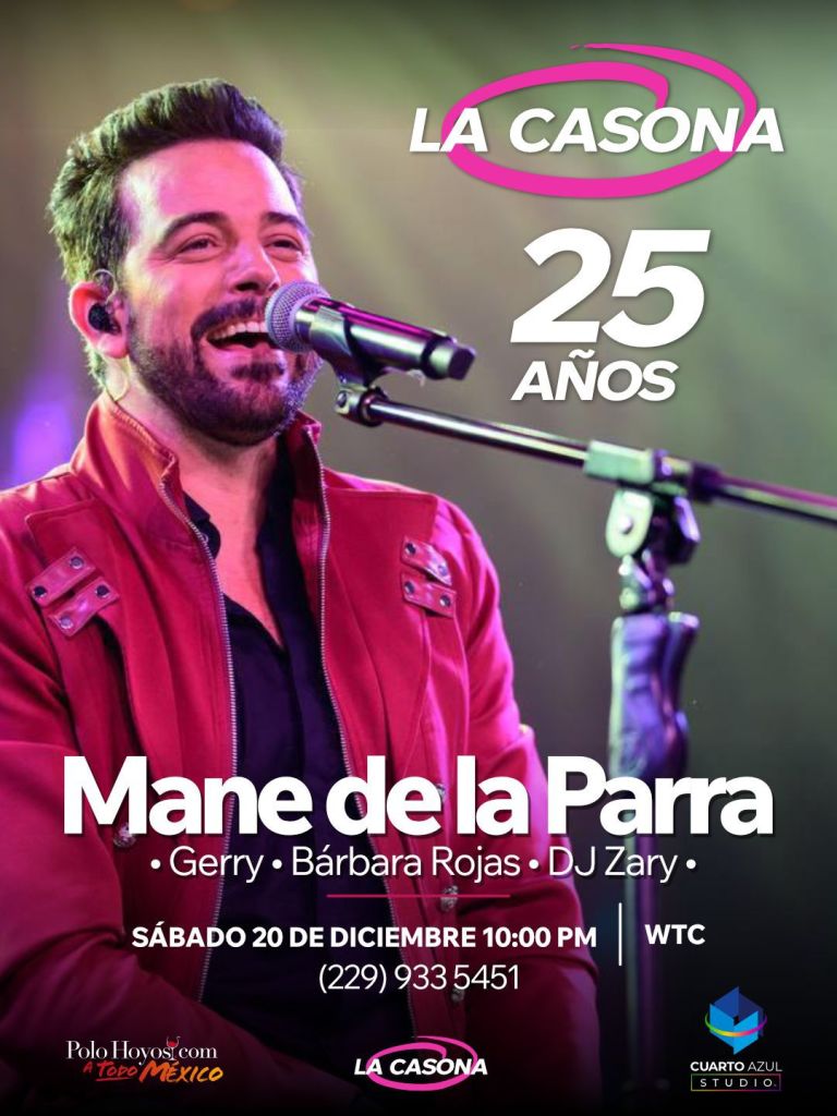 Veracruz, Ver.- La Casona celebrará en grande su 25 aniversario con una noche llena de música, nostalgia y fiesta, teniendo como figura estelar al cantante y actor Mane de la Parra, quien se presentará en concierto el sábado 20 de diciembre en el WTC Veracruz.