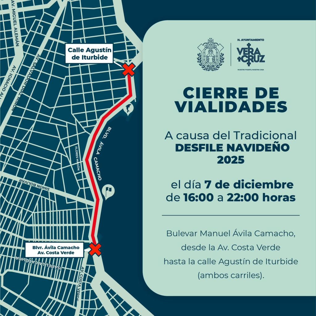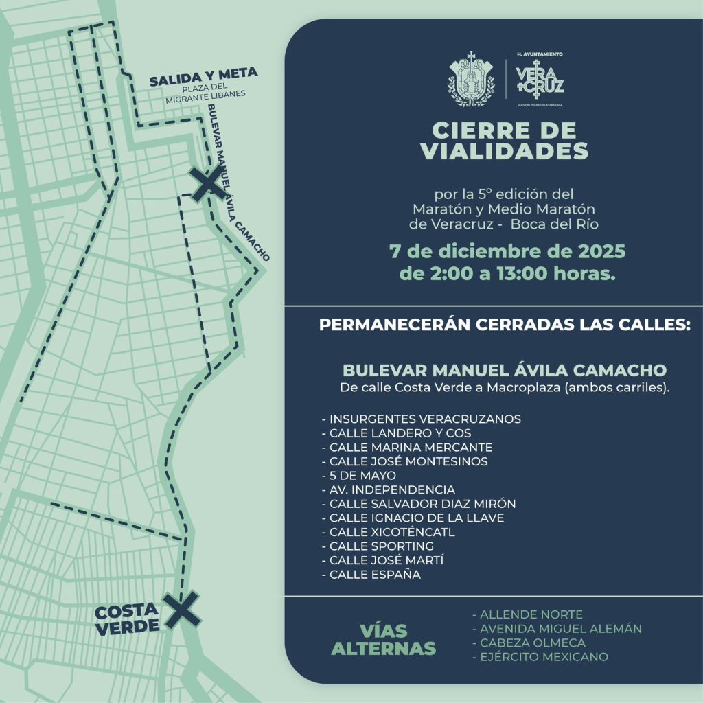 *Veracruz, Ver., a 2 de diciembre de 2025.–* El H. Ayuntamiento de Veracruz informa a la ciudadanía sobre el cierre del bulevar Manuel Ávila Camacho el domingo 7 de diciembre, con motivo de dos eventos de gran afluencia: la 5.ª edición del Maratón y Medio Maratón Veracruz–Boca del Río y el Tradicional Desfile Navideño 2025.