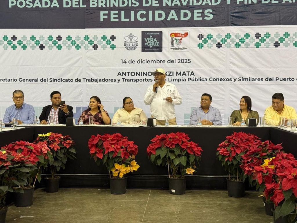 Veracruz, Ver., Diciembre de 2025.— En un ambiente de unidad y convivencia, el Sindicato de Trabajadores y Transportes de la Limpia Pública, Conexos y Similares del Puerto de Veracruz (STYTDLP) llevó a cabo su tradicional Brindis de Navidad y Fin de Año, encabezado por su secretario general, Antonino Baxzi.