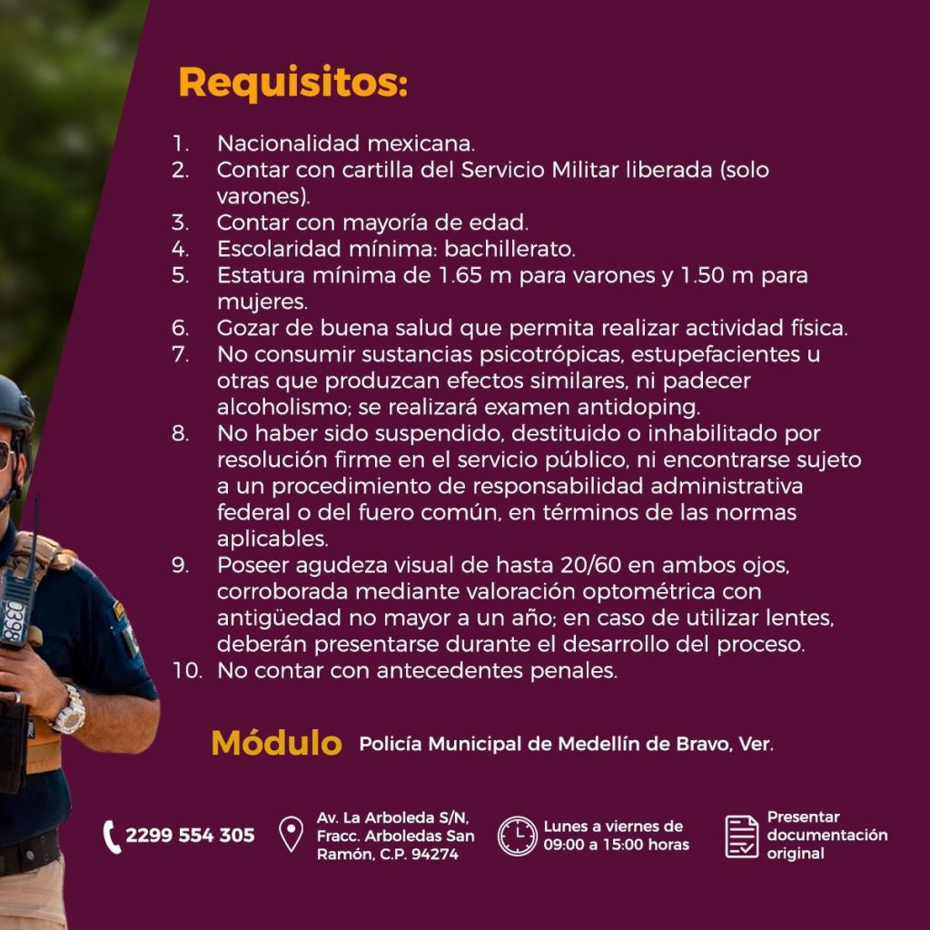 Medellín de Bravo, Veracruz., 07 de enero de 2026.- Con el objetivo de fortalecer la seguridad y continuar construyendo un municipio más ordenado y tranquilo, el Ayuntamiento de Medellín de Bravo, encabezado por el presidente municipal Samuel Acosta, informa a la ciudadanía que se encuentra abierta la convocatoria para integrarse a la Policía Municipal.