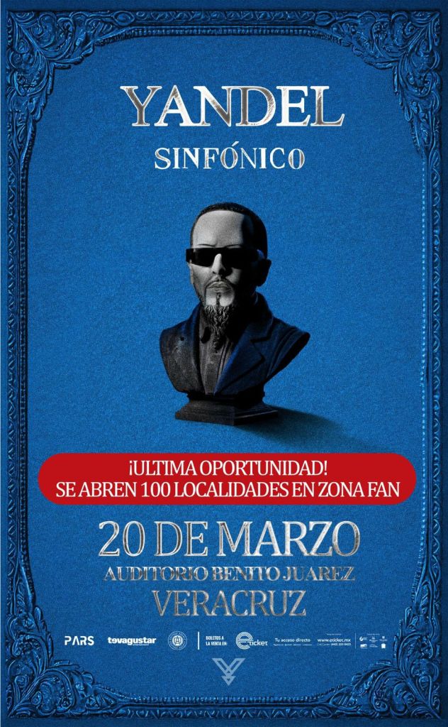 Debido a ajustes en el acomodo del escenario y ante la alta demanda del público, se informa que se habilitarán únicamente 100 lugares adicionales en zona de cancha para la presentación de Yandel Sinfónico en Veracruz que se llevará a cabo el 20 de marzo de 2026 a las 21:00 horas en el Auditorio Benito Juárez.