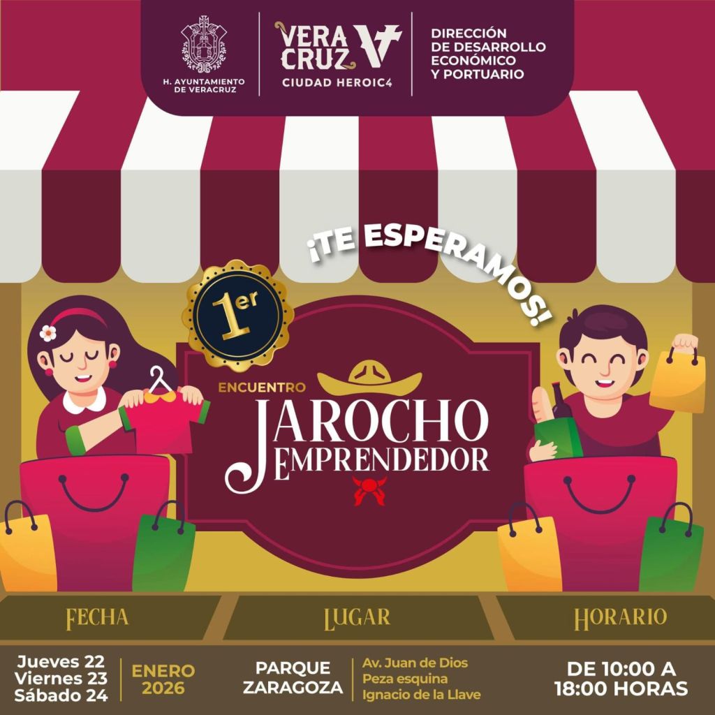 Como parte de las acciones para impulsar el desarrollo económico y fortalecer el emprendimiento local, el H. Ayuntamiento de Veracruz anunció la realización del Primer Encuentro Jarocho Emprendedor, programado del 22 al 24 de enero en el Parque Zaragoza, con la participación de 80 expositores locales.