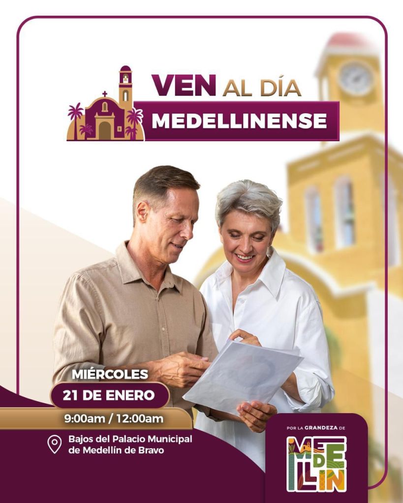 Medellín de Bravo, Veracruz, 19 de enero de 2026.- Con el objetivo de fortalecer la cercanía con la ciudadanía y brindar atención directa y oportuna, el H. Ayuntamiento de Medellín de Bravo, encabezado por el alcalde Samuel Acosta, invita a la población a participar en el “Día Medellinense”, que se llevará a cabo este miércoles, en un horario de 9:00 de la mañana a las 00:00 horas.