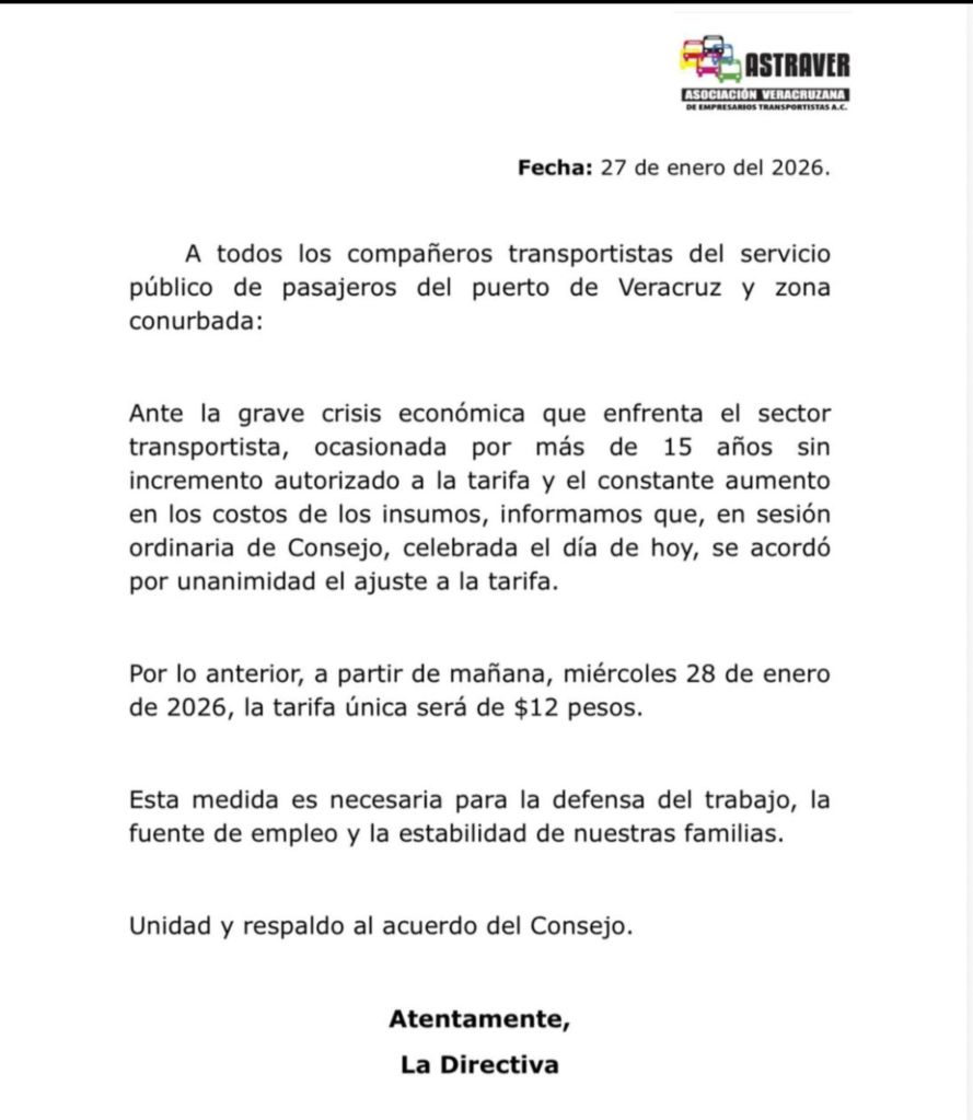 A partir de este miércoles 28 de enero de 2026, la tarifa del transporte público de pasajeros en el puerto de Veracruz y la zona conurbada aumentará a 12 pesos, de acuerdo con un aviso emitido por la Asociación Veracruzana de Empresarios Transportistas A.C. (ASTRAVER).