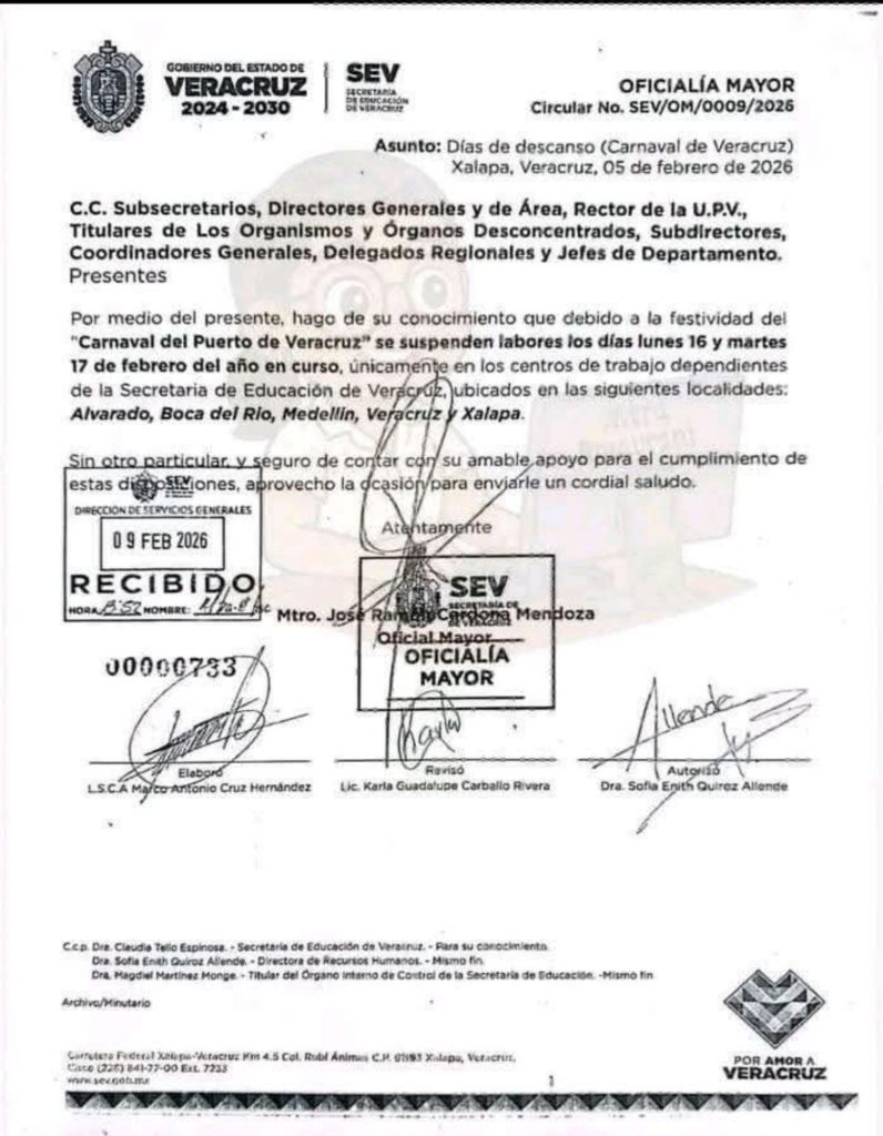 A través de la circular SEV/OM/0009/2026, la dependencia precisó que el descanso aplica únicamente para los centros de trabajo adscritos a la SEV ubicados en los municipios de Veracruz, Boca del Río, Alvarado, Medellín y Xalapa.