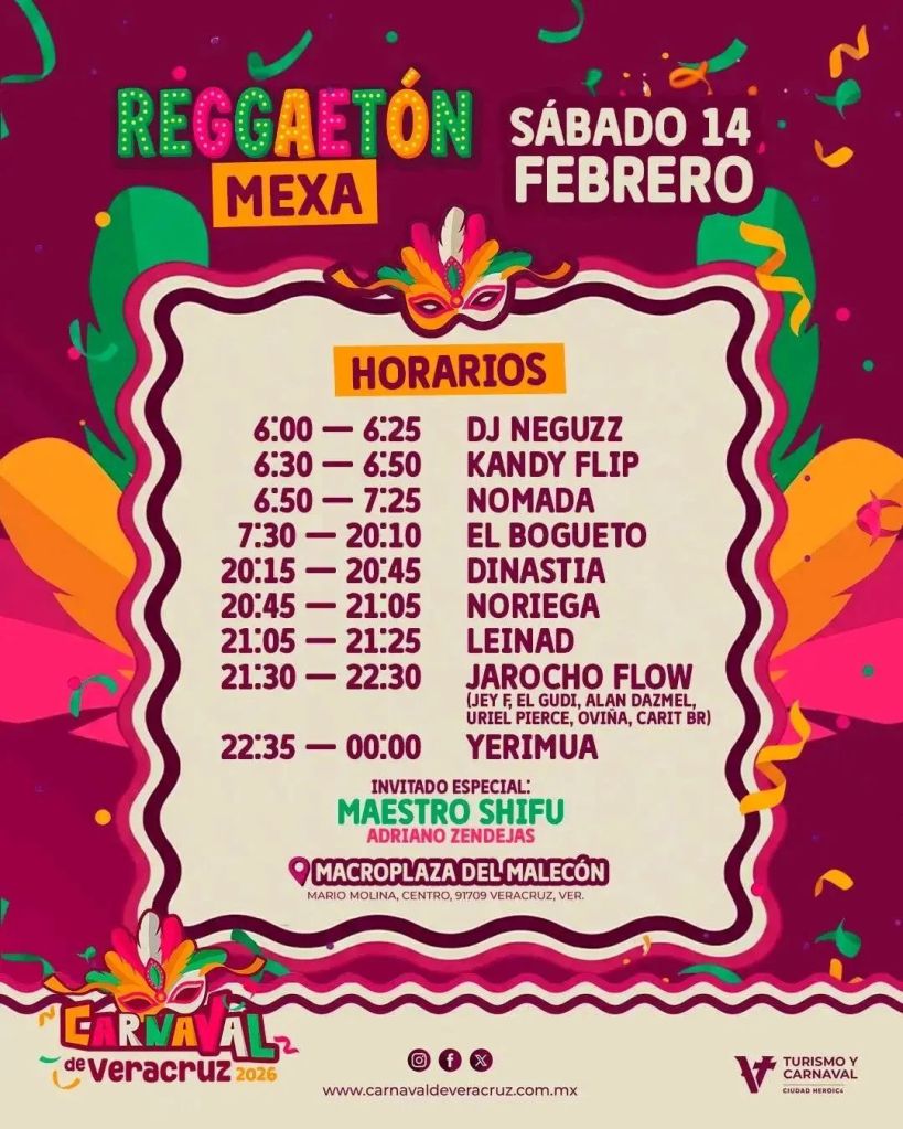 Veracruz, Ver.- El Carnaval de Veracruz 2026 sube la temperatura este sábado 14 de febrero con el espectáculo “Reggaetón Mexa”, un evento que reunirá a exponentes urbanos y talento local en la Macroplaza del Malecón.