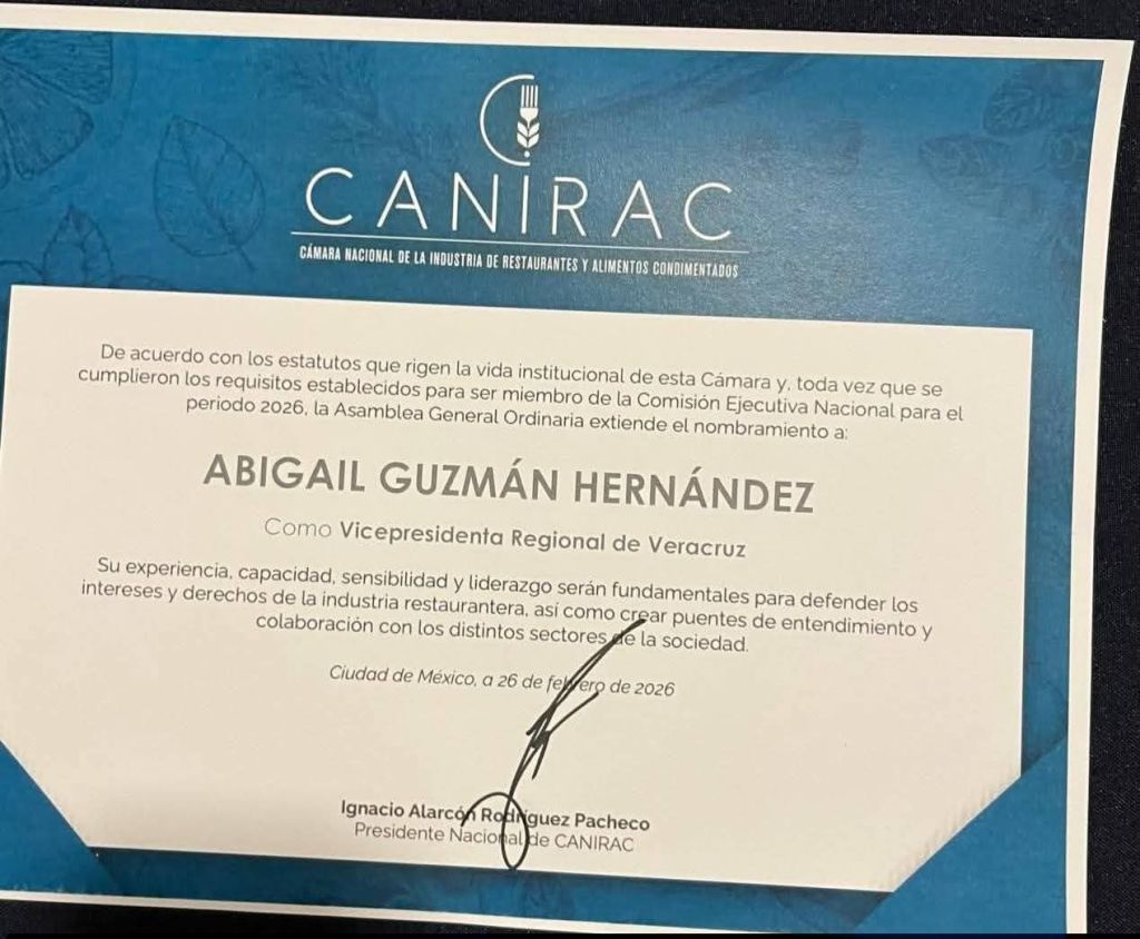 El nombramiento se realizó durante la Asamblea General Ordinaria, donde el presidente nacional de la Canirac, Ignacio Alarcón Rodríguez Pacheco, le entregó el documento que la acredita como Vicepresidenta Regional de Veracruz, con representación y capacidad directiva para los afiliados en todo el estado.