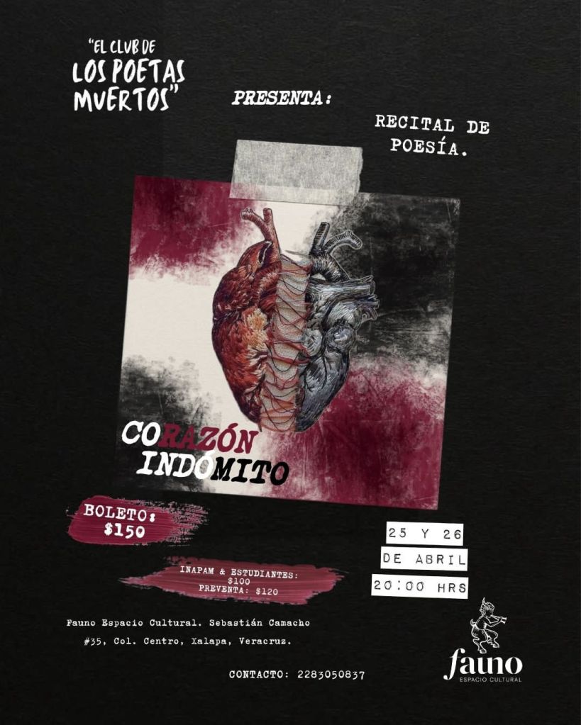 Veracruz, Ver.- Los días 25 y 26 de abril a las 8 de la noche se presentará en el Espacio Cultural Fauno el espectáculo «Corazón Indómito», mismo que se llevará a cabo por la compañía recital de «El Club de los Poetas Muertos» en Xalapa.
