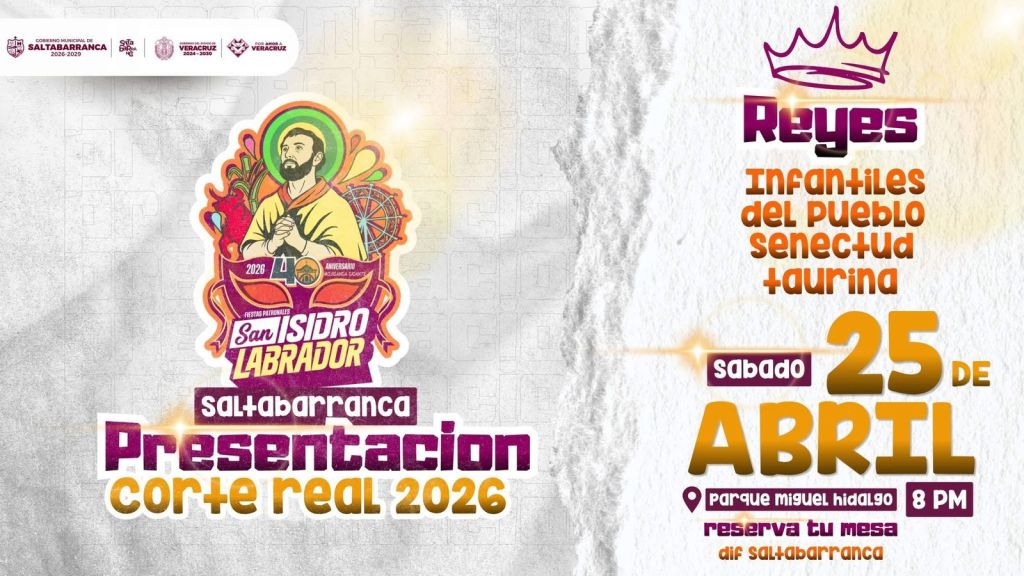 *Saltabarranca, Ver.-* Como parte de las tradicionales fiestas patronales en honor a San Isidro Labrador, el Ayuntamiento de Saltabarranca, encabezado por el alcalde Elvis Laureani Román, invita a la ciudadanía a disfrutar de la esperada Presentación de la Corte Real 2026, un evento que año con año fortalece la identidad, cultura y tradición del municipio.